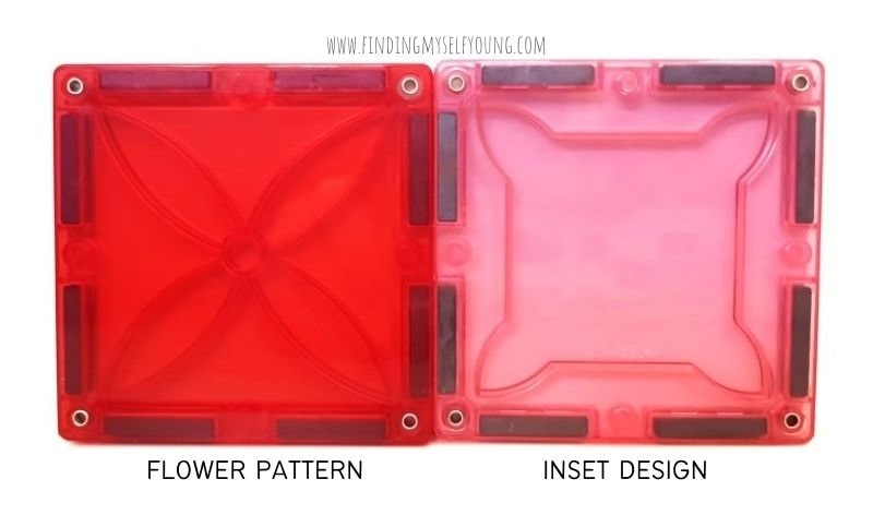 MAGBLOX® small square tiles are available in either the inset design or the flower pattern design. The flower pattern tiles are exclusive to MAGBLOX® and are flat with flower shaped internal bracing. The inset design has a flat rim around the edge of the tiles and the centre is recessed a few mm's to reduce the chance of scratches during play {see close up images below}. All MAGBLOX® tiles have an internal logo that is visible through the tiles, but doesn't cause a raised surface.