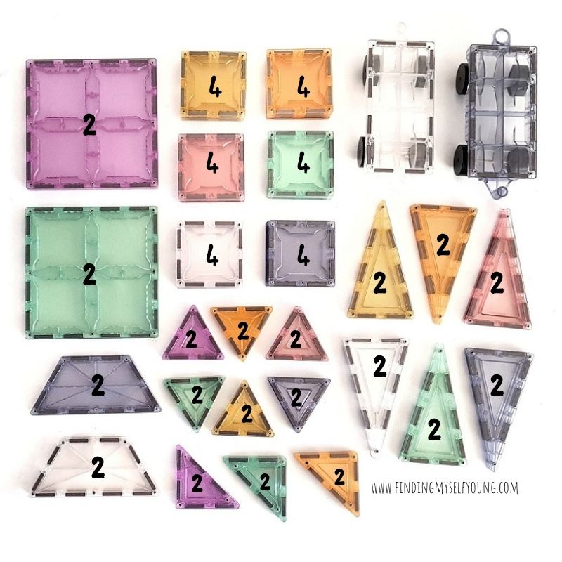 You can see in the image below an exact breakdown of how many tiles you get in the MAGBLOX® pastel set, by shape and colour. There are 3 different car base options, however you only get 2 cars in the set so they'll either be clear and light blue or clear and light pink.