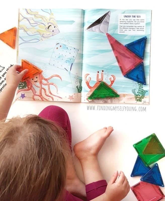 As she worked through the book we talked about what shape tiles she was using and she was able to identify all the different shapes and tell me all about them. The book is a creative way for her to learn about shapes as she felt like she was playing the whole time rather than doing a learning activity.