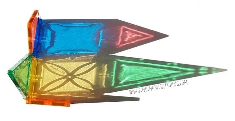If you want to have some scientific fun with magnetic tiles then try stacking them up vertically against a sunny window, or take them outside in the sun to see what refractions they make. A refraction is the bending of light as it passes from one transparent source to another. As the sunlight shines through the magnetic tiles it creates beautiful coloured shadows. This is a really simple way to demonstrate physics to younger children.