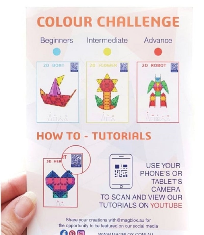 The MAGBLOX® challenge cards are a set of 18 double sided printed cards that include 2D and 3D building challenges ranging from beginner to intermediate and advanced builds. The challenge cards are great to have on hand at home {or in the classroom with multiple students during group sessions} to allow each individual child to focus on a specific build. Each card has the flat 2D and 3D versions of the same build, including shapes, objects and animals. The more advanced builds also have QR codes that lead to a corresponding YouTube tutorial so children can follow along with step by step instructions.