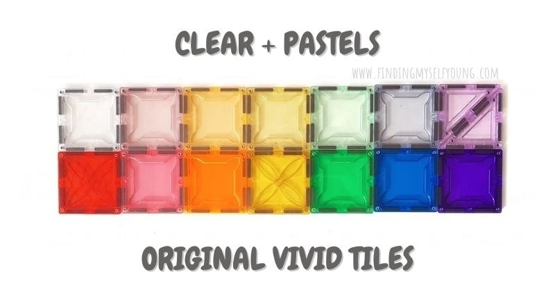 MAGBLOX® were originally only available in the vivid colour range, however now they've added the pastel range you may be wondering how the two colour ways compare, so I've put together a comparison picture. The original rainbow tiles are available in 7 colours and the pastel range is only available in 6 colours + clear, so there's no pastel red tiles.