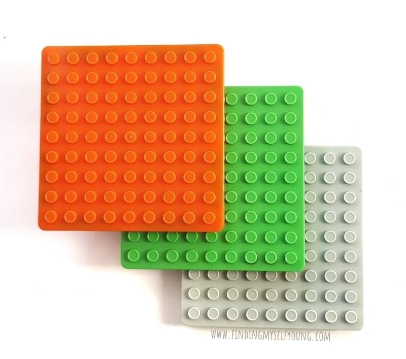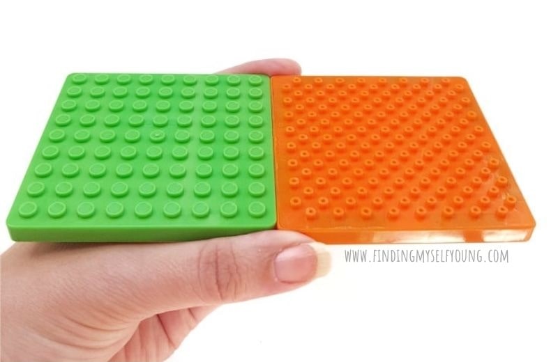 The MAGBRIX® tile surface has 2 different sides, the top side where the bottom of the building bricks click onto {green tile in image below} and the underneath where the top of building bricks can click into {orange below}.