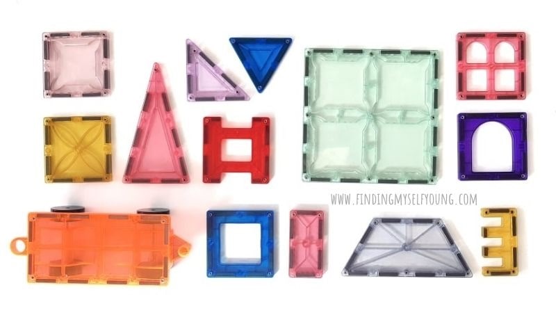 What I really love about this set though {other than again the same number of tiles for each colour in each individual shape} is that there's clear magnetic tiles! They're so much fun to build with as you can completely see through them. My daughter calls them Elsa's ice tiles {because, Frozen is life}.